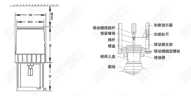 1.將執(zhí)行機(jī)構(gòu)支架套在銅閥連接器上,旋緊執(zhí)行機(jī)構(gòu)固定螺絲。